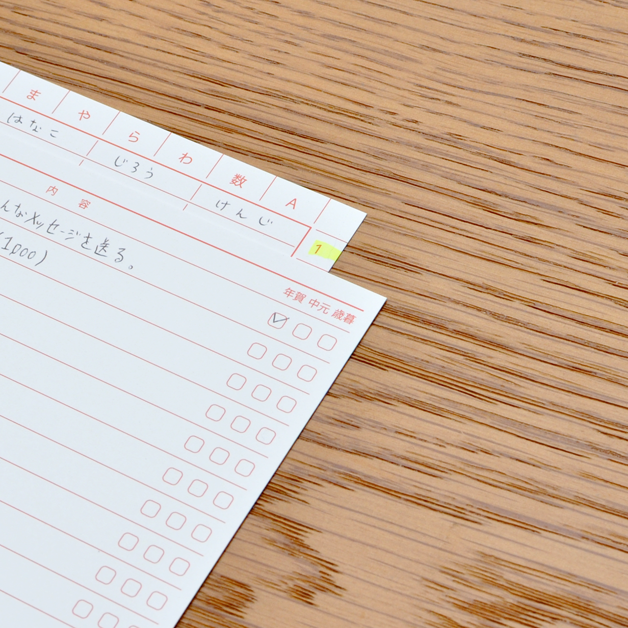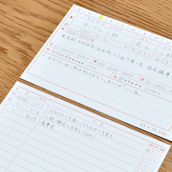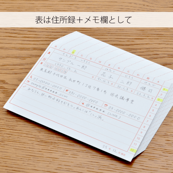 はがきサイズのカードタイプとなっていますので、カードボックス(年賀状保存などのものでも)に収納して管理するのがおススメです。