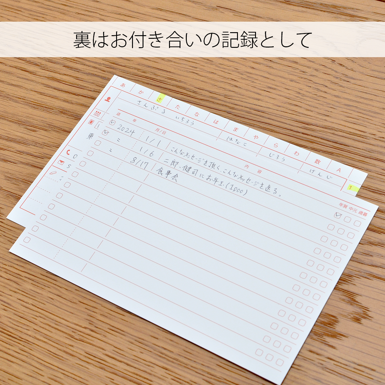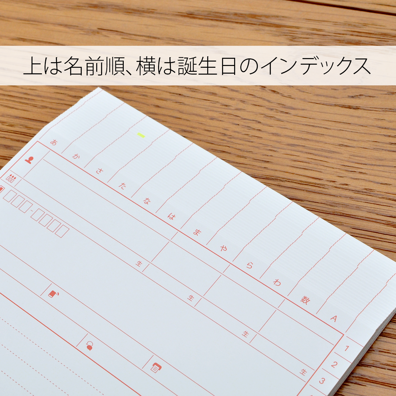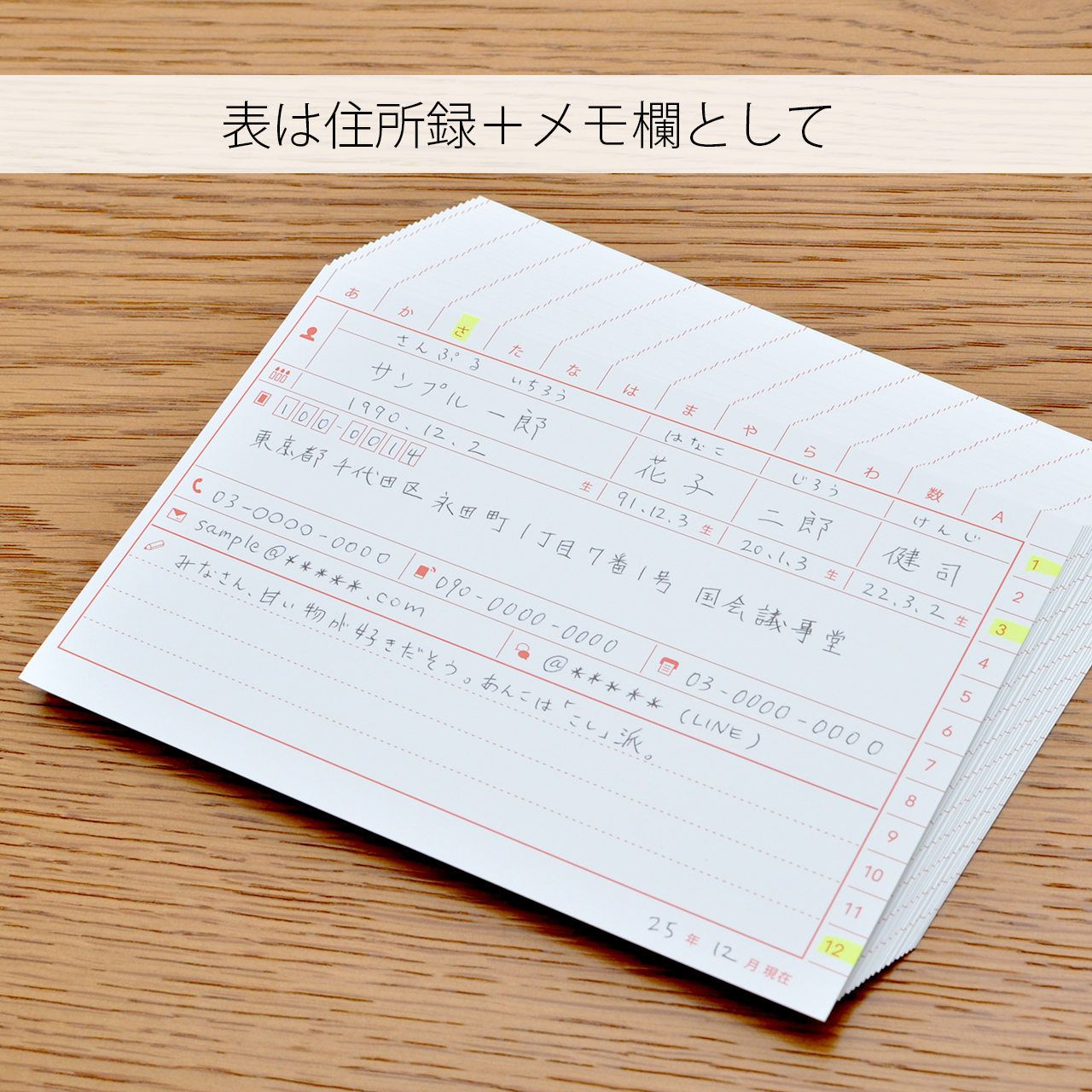 インデックス機能が付いた住所録カードを作ってみました。ひとり(一家族)につき1枚を使って、以下の情報を記入することができます。