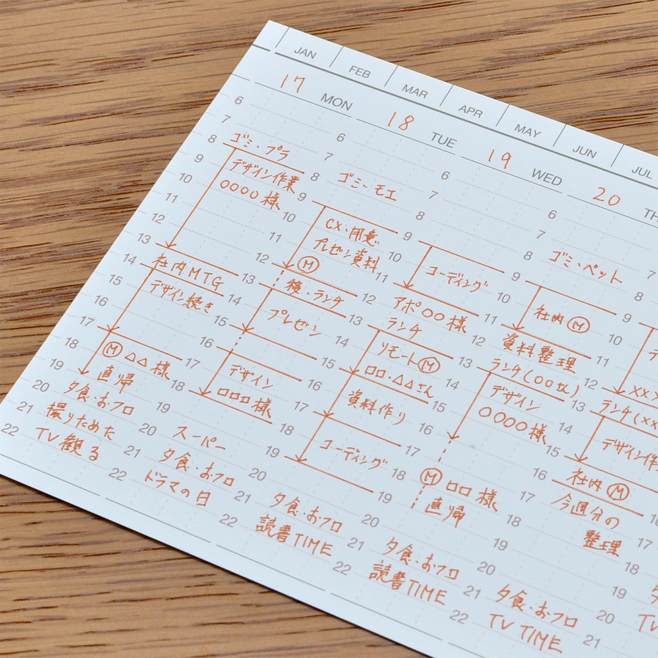 1枚1枚がバラになった手帳です。クリップや愛用のノートに挟んだりして、必要な数だけを持ち歩くスタイルなので、鞄の中が最小限のスペースだけで済むのが便利なところ。 また紙の厚さがハガキ並みにあるのも特徴です。1枚だけ持ち歩いてもヨレにくいし、デスクなどに立てかけておくこともできます。