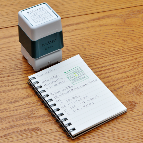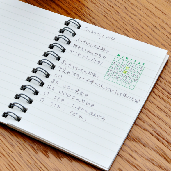 もうひとつはA7サイズの小さなダブルリングノートに押して、簡単なマンスリースケジュールを作ってみました。