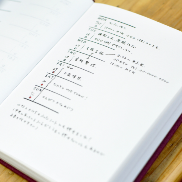 仕様は日付を書く欄のほか、お休みの日に塗りつぶす小さな丸や、日またぎの予定を入れるときに引く、線の補助となるようなドットのラインもございます。