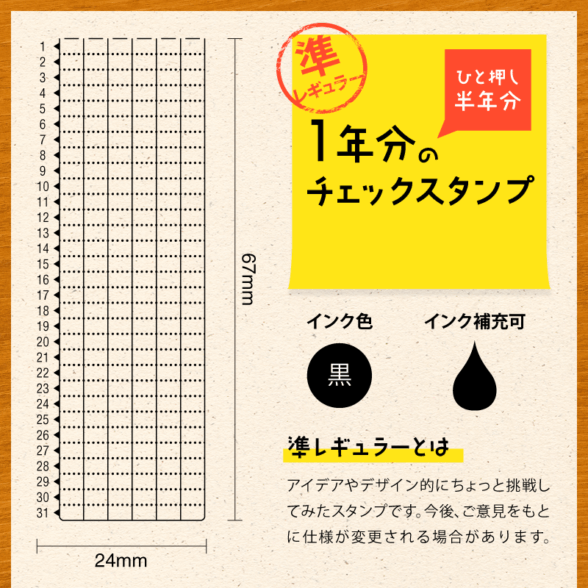 ⇒ ふた押しで1年分(ひと押し半年)のチェック欄を作れるスタンプです。