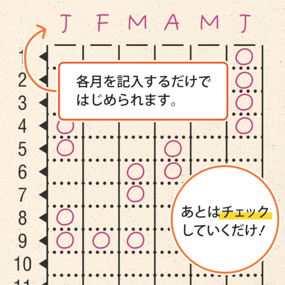 使い方はとてもシンプルで、1月から12月までの各月を書くだけでスタートできます。あとは好きなテーマを決めて、日々チェックをしてくだけ。